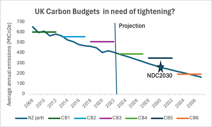 The independent Climate Change Committee (CCC) is tasked with monitoring the government’s progress in climate mitigation under the 2008 Climate Change Act. It’s current focus is on progress towards two medium term targets: (1) to cut UK GHG emissions by at least 68% by 2030 in line with the UK’s Nationally Determined Contribution (NDC) to meet the Paris Agreement goal of limiting global warming to 1.5°C; and (2) to cut the 5-year cumulative level of emissions to 965 MtCO2e by 2033-2037 in line with the government’s Sixth Carbon Budget. The Third, Fourth and Fifth Carbon Budgets are stepping stones to these medium term targets.
